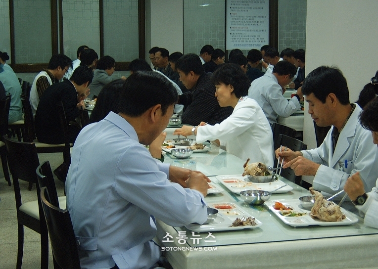 ¿ø±¤´ëÇк´¿ø(º´¿øÀå ±èÀç´ö)¿¡¼ ÀÇ»ç¿Í °£È£¸¦ ºñ·ÔÇÑ Àü Á÷¿øÀÌ 2006³â 12¿ù 1ÀÏ º´¿ø ±¸³»½Ä´ç¿¡¼ ½Ã¹ÎµéÀÌ ¾È½ÉÇÏ°í ´ß°í±â¸¦ ¸Ô¾îµµ ±¦Âú´Ù´Â °ÍÀ» º¸¿©ÁÖ±â À§ÇØ »ï°èÅÁÀ¸·Î Á¡½É½Ä»ç¸¦ Çß´Ù.