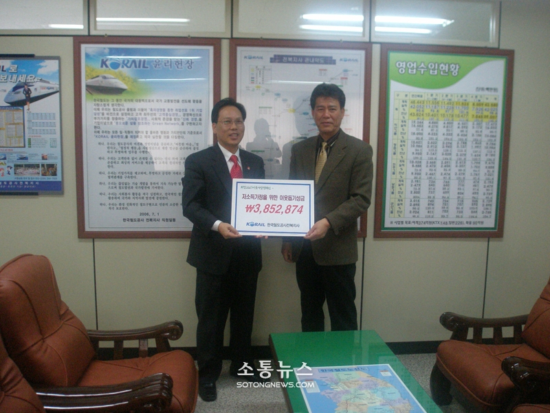 Çѱ¹Ã¶µµ°ø»ç ÀüºÏÁö»ç(Áö»çÀå ±èõ°æ)´Â 12¿ùÀ» »ç¶û³ª´®ÀÇ ´Þ·Î ÁöÁ¤Çϰí 22ÀÏ, Áö»ç³» Á÷¿øµéÀÇ Á¤¼ºÀÌ ´ã±ä »ç¶ûÀÇ ¼º±Ý 3,852,874¿øÀ» '»çȸº¹Áö°øµ¿¸ð±Ýȸ ÀüºÏÁöȸ'¿¡ Àü´ÞÇÏ´Â µî ¿¬ÀÌÀº »ç¶û³ª´® Çà»ç¸¦ ÆîÃÄ ÁÖÀ§¸¦ ÈÆÈÆÇÏ°Ô ÇϰíÀÖ´Ù.